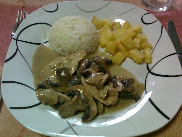 Começo por grelhar numa frigideira, em um pouco de azeite, os bifinhos de frango temperados de sal, não grelhar muito retiro e reservo mantendo-os quentes. Entretanto adiciono os cogumelos os alhos e deixo saltear um pouco. Junto o caldo o vinho do porto e deixo levantar fervura, para que o vinho evapore um pouco. adiciono o bechamel deixo ferver, rectifico os temperos e está pronto a degustar. Servi acompanhado de arroz branco e batata frita.